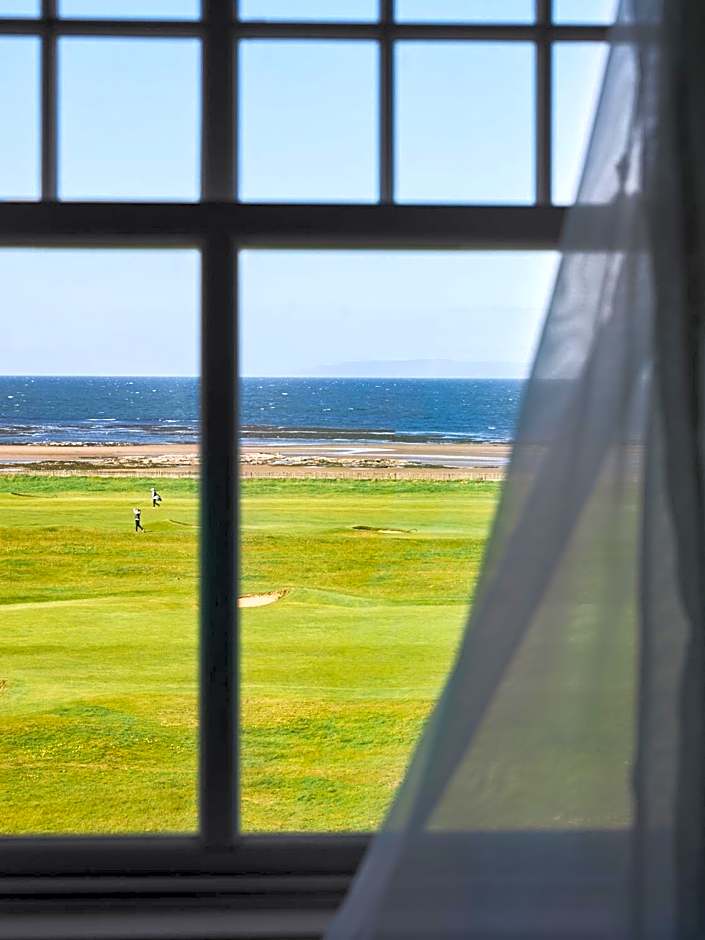 These rooms have glorious views of Royal Troon and the rugged Ayrshire coastline. The décor reflects the autumn colors of the stunning surrounding scenery, and the room features classic dark wooden furnishings. The rooms are light and airy with easy chairs and a coffee table, and come with bathrobes and slippers, as well as facilities for making tea and coffee.